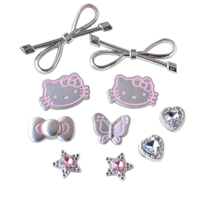 Dieses Set von Dekorationen für Crocs enthält 10 Stück Accessoires, die mehrere Motive in einem einheitlichen Farbdesign kombinieren. Auf den ersten Blick fällt die Verbindung von zarten rosafarbenen Details mit einem silbernen Grundton auf, wodurch die Dekorationen ausgewogen und übersichtlich wirken. Unter den einzelnen Elementen finden Sie Motive von Hello Kitty, Schleifen, Schmetterlingen und Strass, die dem gesamten Set ein abwechslungsreiches Aussehen verleihen.
