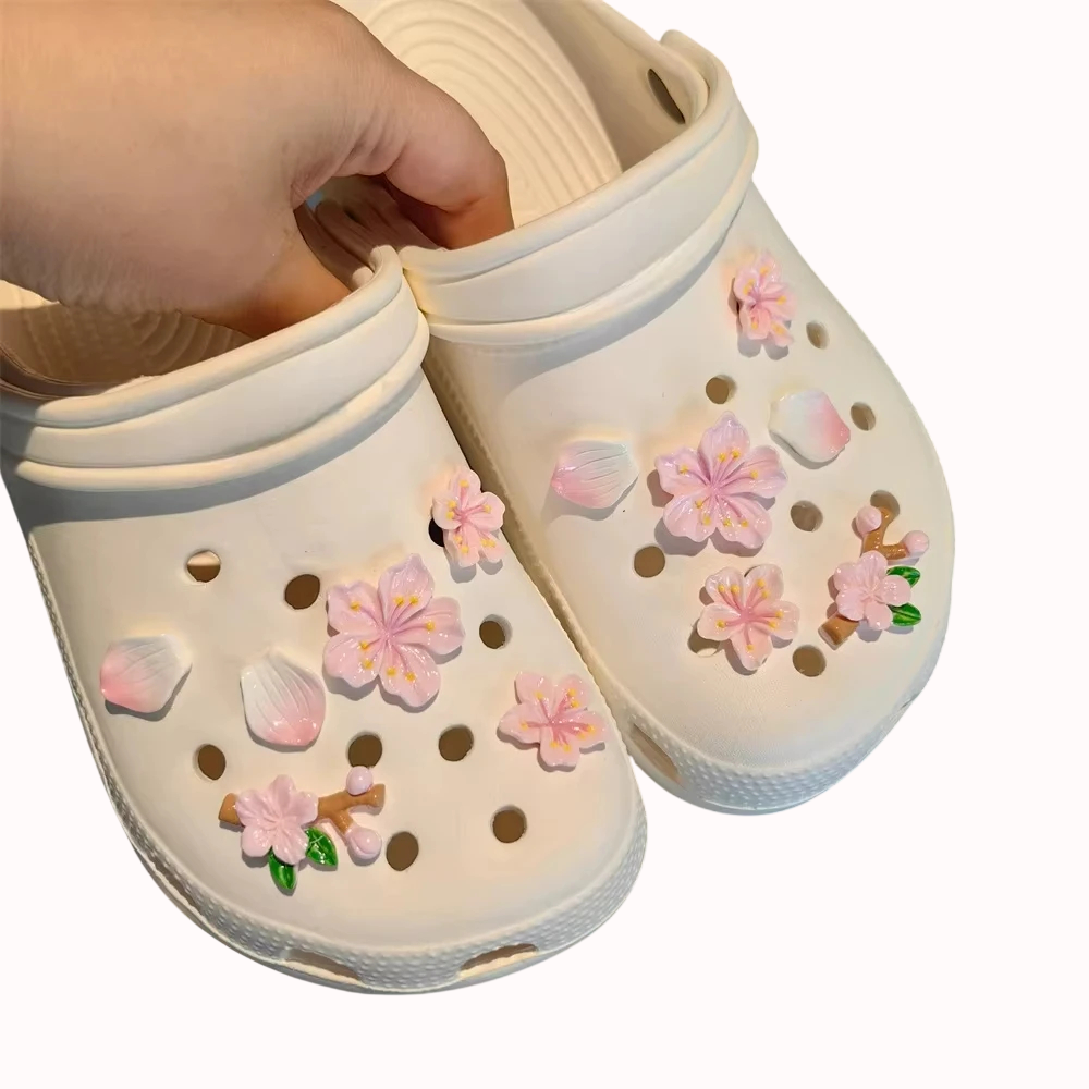 Dekorationen für Crocs mit Kirschblütenmotiv bieten eine einfache Möglichkeit, den Schuhen ein zartes und dekoratives Aussehen zu verleihen. Das Set enthält Blumenmotive, die von natürlichen Motiven inspiriert sind und dezent wirken, während sie gleichzeitig alltägliche Clogs aufpeppen. Dank des 3D-Designs der Blumen kommt die detailreiche Struktur der einzelnen Ornamente gut zur Geltung.