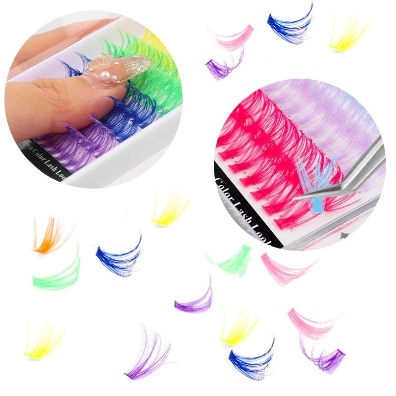 Farbige Cluster-Wimpern verleihen den Augen voluminösen Ausdruck und ein originelles Aussehen. Ideal für kreatives Make-up, Festivals und professionelle Wimpernverlängerungen. Vollständige Beschreibung