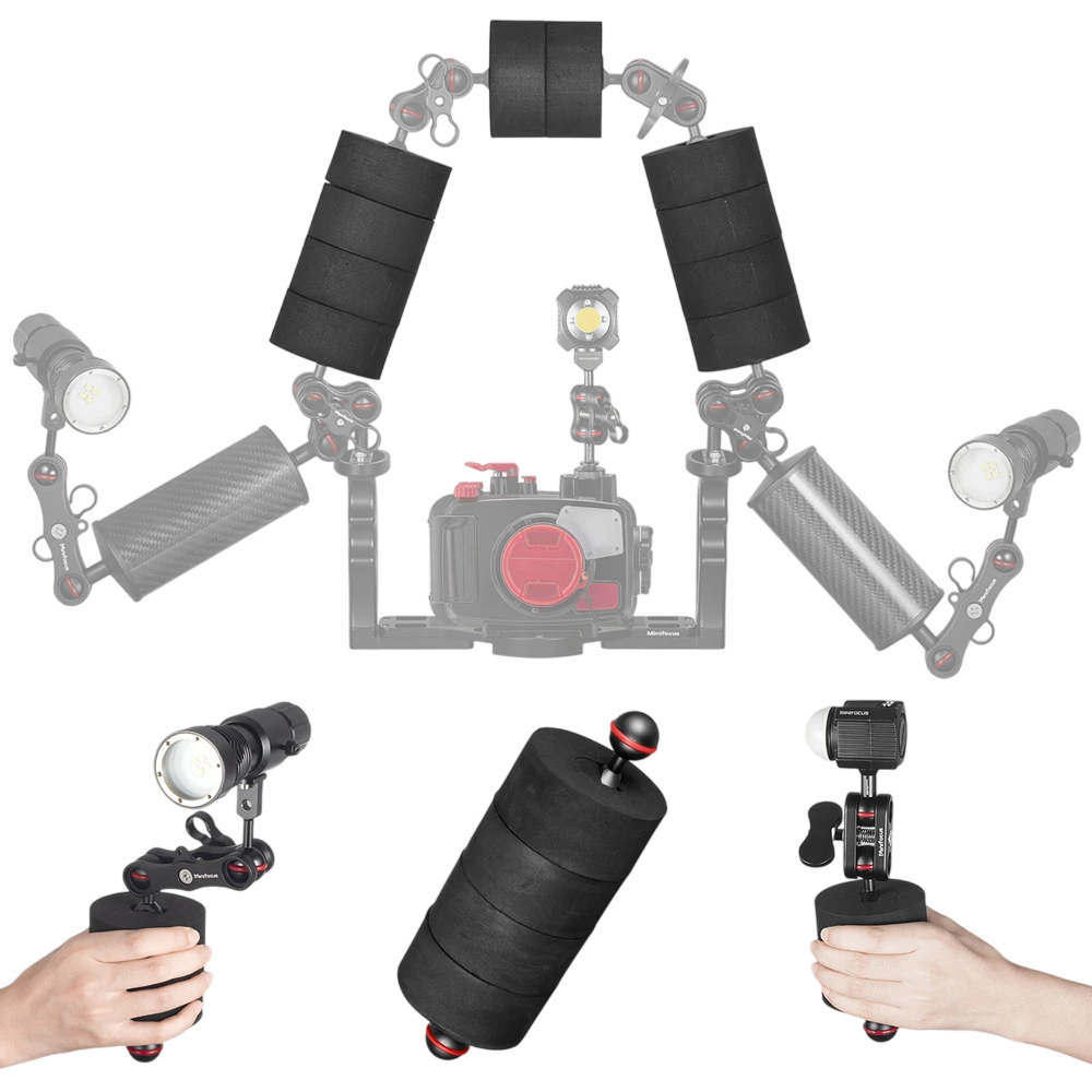Praktisches Set von Schwimmern, das Auftrieb und Stabilität der Kamera beim Filmen unter Wasser gewährleistet, geeignet für Tauchen und Freizeitanwendungen. Vollständige Beschreibung