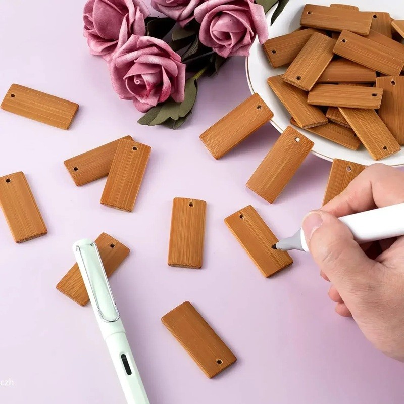 Die Anhänger sind leicht, stabil und einfach zu bearbeiten, was sie großartig für verschiedene DIY-Projekte macht, wie handgefertigte Geschenke, Einladungen oder personalisierte Schlüsselanhänger. Dank des natürlichen Aussehens des Bambus verleihen sie jedem Gegenstand ein natürliches, rustikales Aussehen, was sie ideal für Hochzeiten, Geburtstagsfeiern oder Firmenveranstaltungen macht.