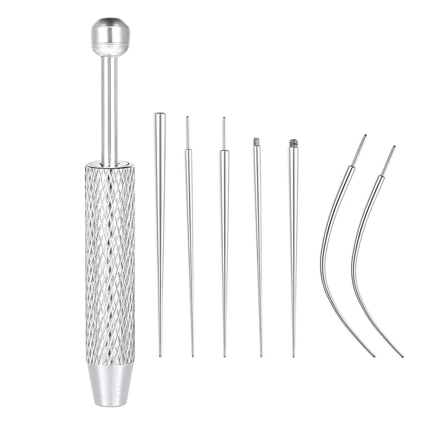 Dieses Set von Einführungsstiften ist für jeden gedacht, der ein praktisches Hilfsmittel für den Umgang mit Piercing-Schmuck sucht. Die gebogene konische Form ermöglicht ein sanftes Einführen des Schmucks in die Einstichstelle und hilft, während des Anlegens oder Wechsels eine bessere Kontrolle zu behalten. Das verwendete Titan ist leicht und angenehm zu berühren, was zu einer komfortablen Handhabung beiträgt. Die silberne Farbgebung wirkt neutral und lässt sich leicht mit verschiedenen Schmuckarten kombinieren. Dieses Werkzeug ist für eine breite Palette von Piercings geeignet und ideal für Nasen-, Lippen-, Knorpel- und andere Körperpiercings.
