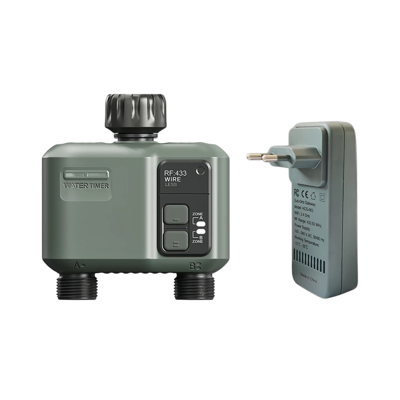 Praktischer smarter Timer mit doppeltem Ausgang, Regensensor und WiFi-Anschluss für eine effiziente automatische Gartenbewässerung. Vollständige Beschreibung