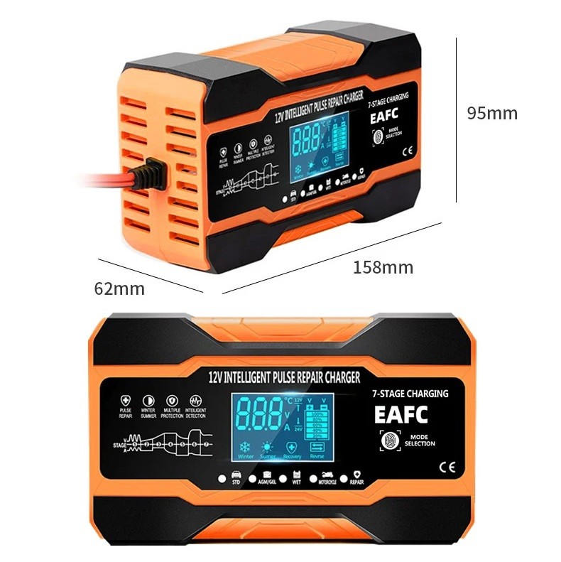 Intelligentes Ladegerät 12 V 12 A mit LCD-Display, Pulsmodus und Sommer-/Wintereinstellung. Für PKW und Motorräder. EU-Stecker. Vollständige Beschreibung
