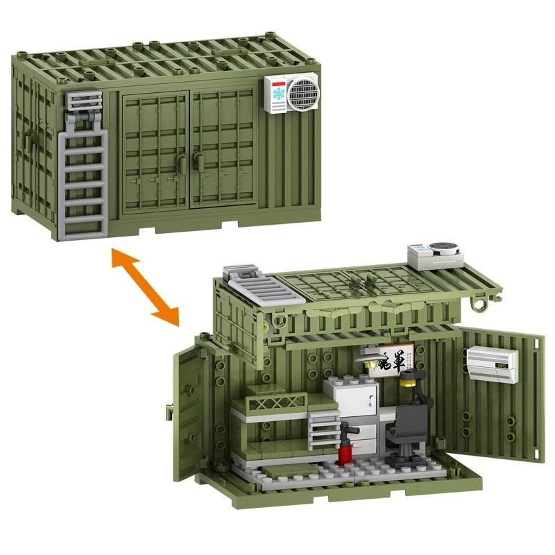 Das Set enthält 93 Teile, die so gestaltet sind, dass sie eine stabile Konstruktion für Spiel und Ausstellung bilden. Dank der drehbaren Türen und des öffnenden Daches lässt sich das Interieur, die Accessoires und die Szenen leicht arrangieren. Der Container kann als Teil einer größeren Sammlung oder als eigenständiges dekoratives Modell genutzt werden. Der Bausatz ist ideal für Kinder und Erwachsene, die Wert auf ausgeklügelte Miniaturen und realistische militärische Umgebungen legen.