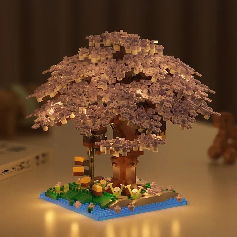 Das auffälligste Element des gesamten Bausatzes ist die üppige Blütenkrone, die aus Hunderten von kleinen Blüten in Lila- und Lavendeltönen mit weißen Köpfen besteht. Diese Blumen vermitteln den Eindruck eines reich blühenden Baumes in voller Frühlingszeit, wenn die Sakura den Lebenszyklus und die Schönheit der Vergänglichkeit symbolisiert. Die Krone breitet sich weit aus und vermittelt den Eindruck, dass die Äste buchstäblich mit Blüten bedeckt sind, die sanft über die Ränder des Baumes hängen.
