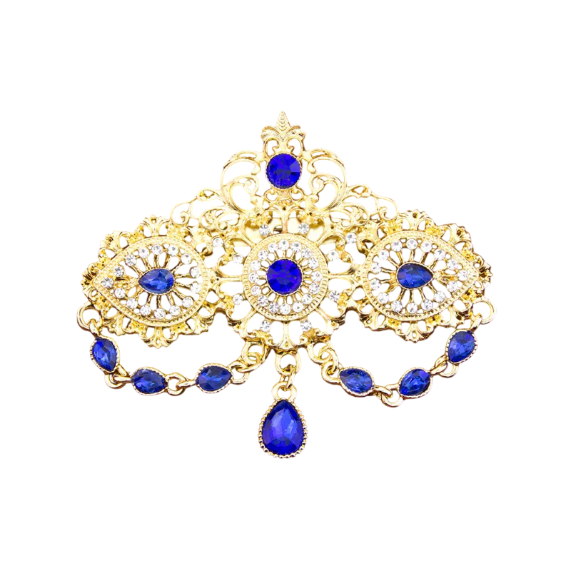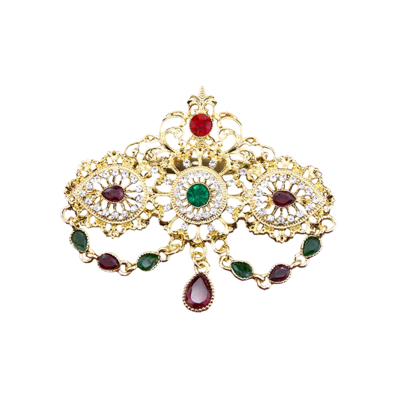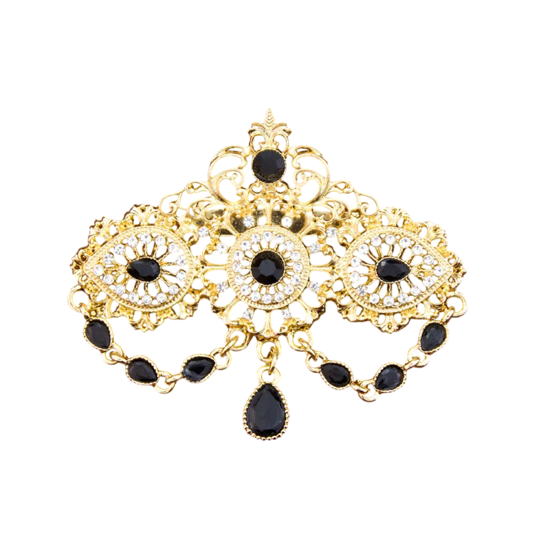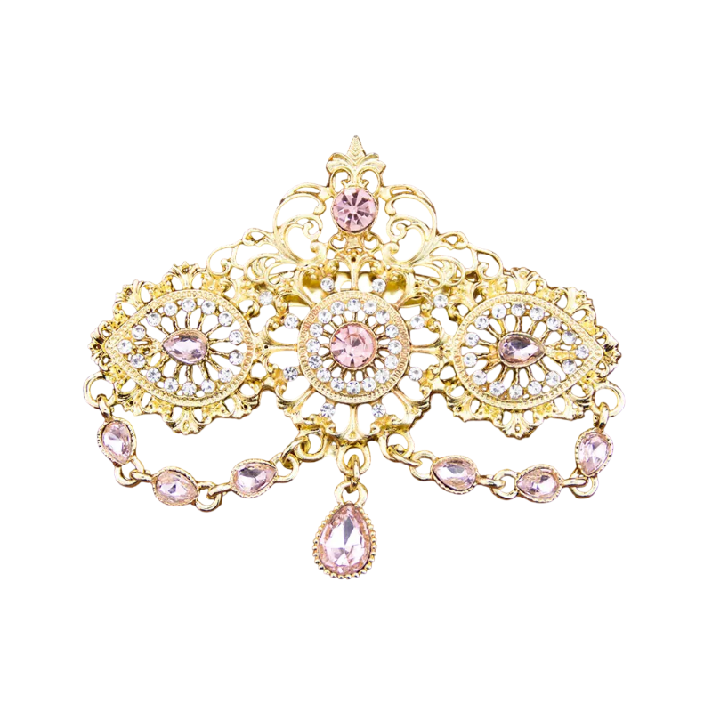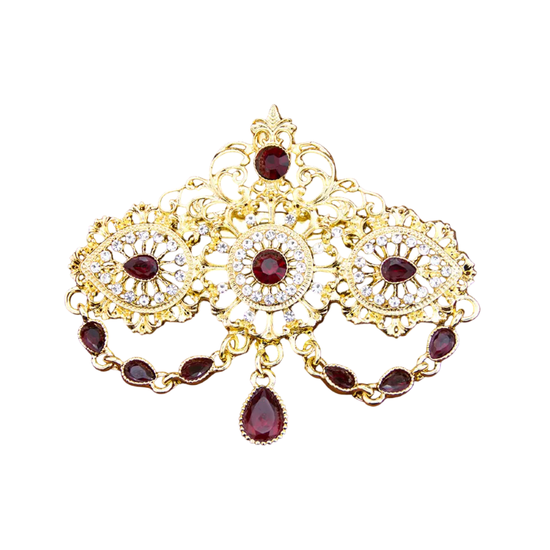 Diese dekorative Brosche mit kristallinem Anhänger und Steinen ist ein auffälliges Zubehör, das durch seine detailreiche Verarbeitung Aufmerksamkeit erregt. Die Kombination aus dekorativen Elementen, Ketten und dem zentralen Anhänger schafft ein komplexes Design, das für verschiedene Kleidungsstile geeignet ist. Aufgrund ihres Aussehens eignet sie sich besonders als Zubehör für Mantel, Sakko oder Kleid.