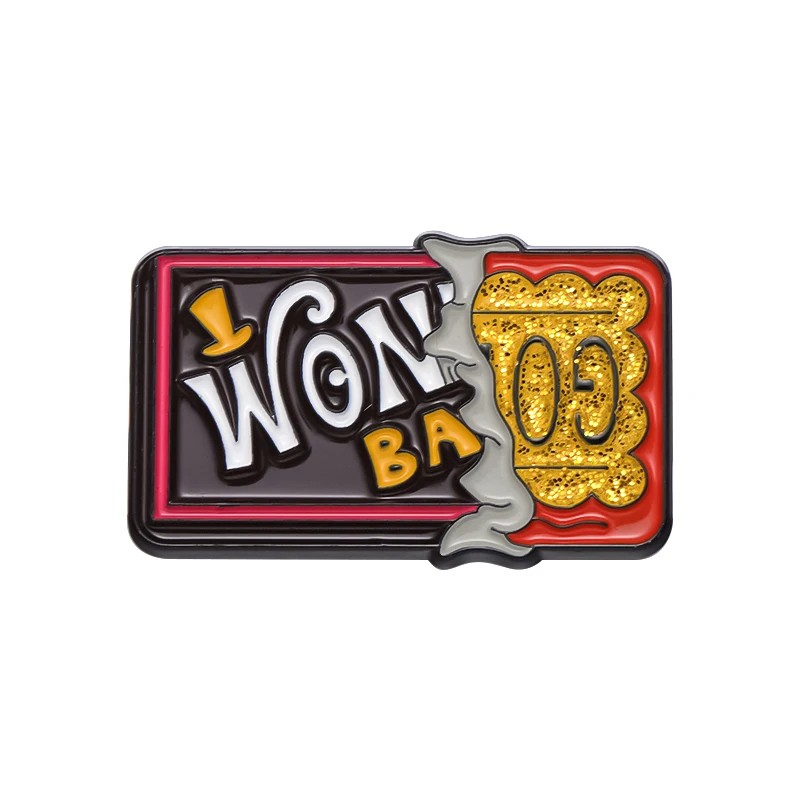 Dieser metallische Anstecker in Form von Schokolade mit dem Motiv des goldenen Gutscheins ist ein interessanter Zusatz, inspiriert von einem bekannten Film-Motiv. Die detaillierte Ausführung und das farbenfrohe Design verleihen der Brosche ein markantes Aussehen, das sofort ins Auge fällt. Sie eignet sich als kleiner Zusatz für Kleidung oder verschiedene textile und nicht-textile Gegenstände.