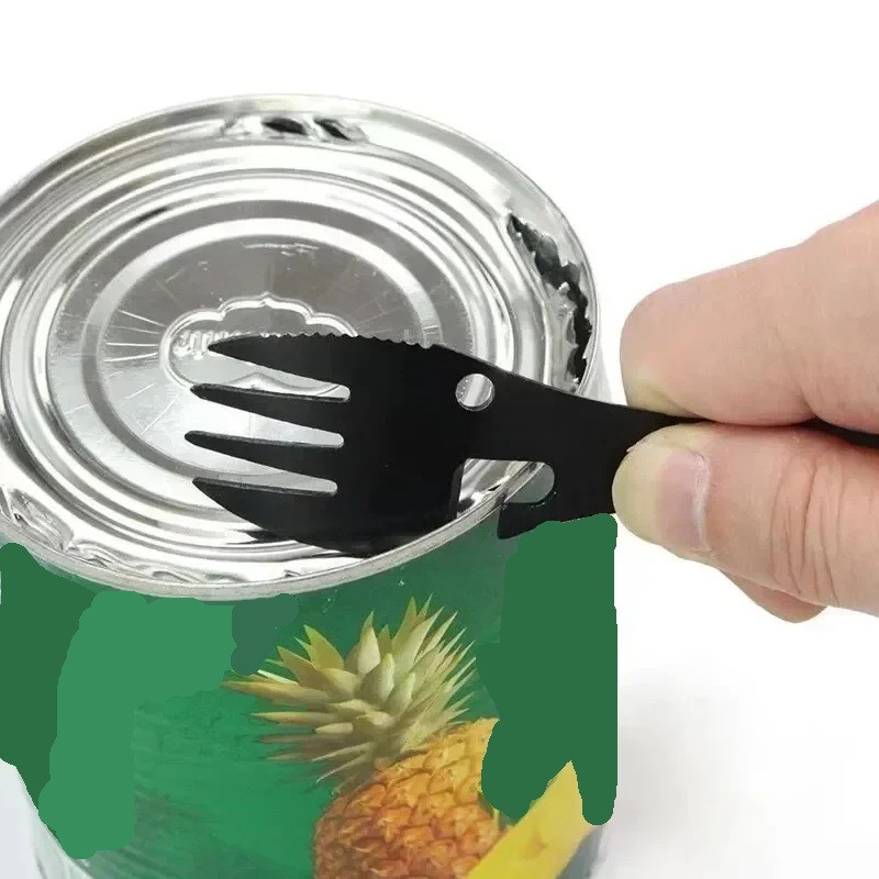 Die multifunktionale Konstruktion enthält Löffel, Gabel und Flaschenöffner, die in einem Werkzeug integriert sind. Diese Art von Geschirr kann das Essen beim Camping, Picknicken oder anderen Outdoor-Aktivitäten erleichtern. Das einfache Design ermöglicht die Nutzung beim Verzehr verschiedener Arten von Speisen.