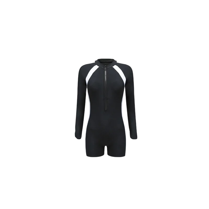 Dieser moderne Einteiler in Schwarz ist die ideale Wahl für Frauen, die Funktionalität, Komfort und sportlichen Stil suchen. Das einfarbige Design wirkt elegant und zeitlos, sodass es sich leicht mit weiteren Strandaccessoires kombinieren lässt. Der Rundhalsausschnitt mit praktischem Reißverschluss ermöglicht ein einfaches An- und Ausziehen sowie eine individuelle Anpassung der Ausschnitttiefe. Der lange Arm bietet zusätzlichen Schutz vor Sonne und kühlem Wasser. Das Shorts-Unterteil sorgt für Sicherheit und Komfort bei Bewegung und aktivem Schwimmen.
