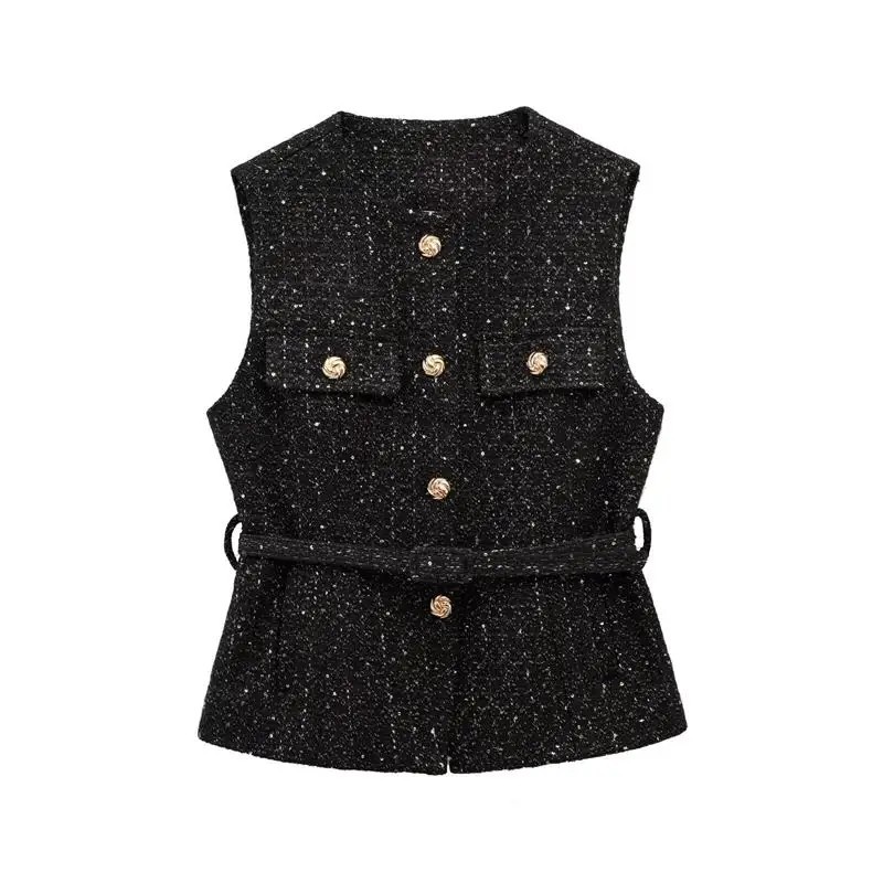 Stylische Damenweste mit Gürtel in der Taille und Taschen auf der Brust. Eleganter Schnitt mit Rundhalsausschnitt und Knopfverschluss für einen modernen Look. Vollständige Beschreibung