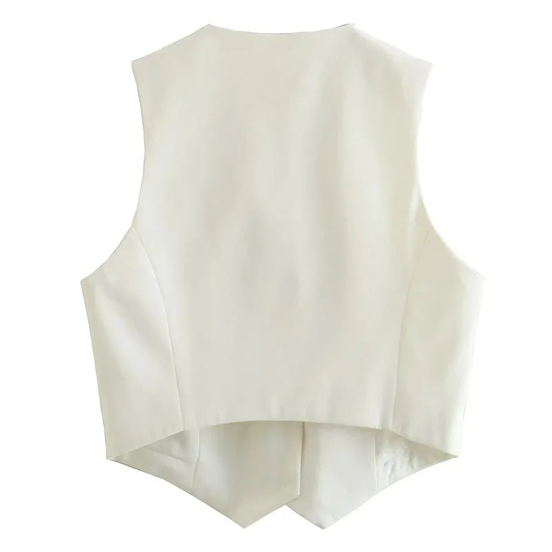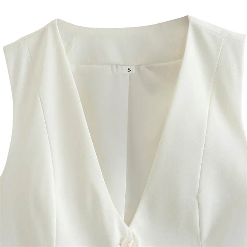 Elegante Damenweste mit V-Ausschnitt und Knopfverschluss. Stylisches Accessoire aus leichtem Polyester, erhältlich in mehreren Farben. Vollständige Beschreibung