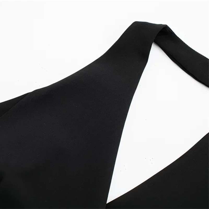 Elegante Damenweste mit Trägern um den Hals und Bindeband im Rücken. Leichter Polyester, Taschen an den Seiten und Knopfverschluss für modernen Stil. Vollständige Beschreibung
