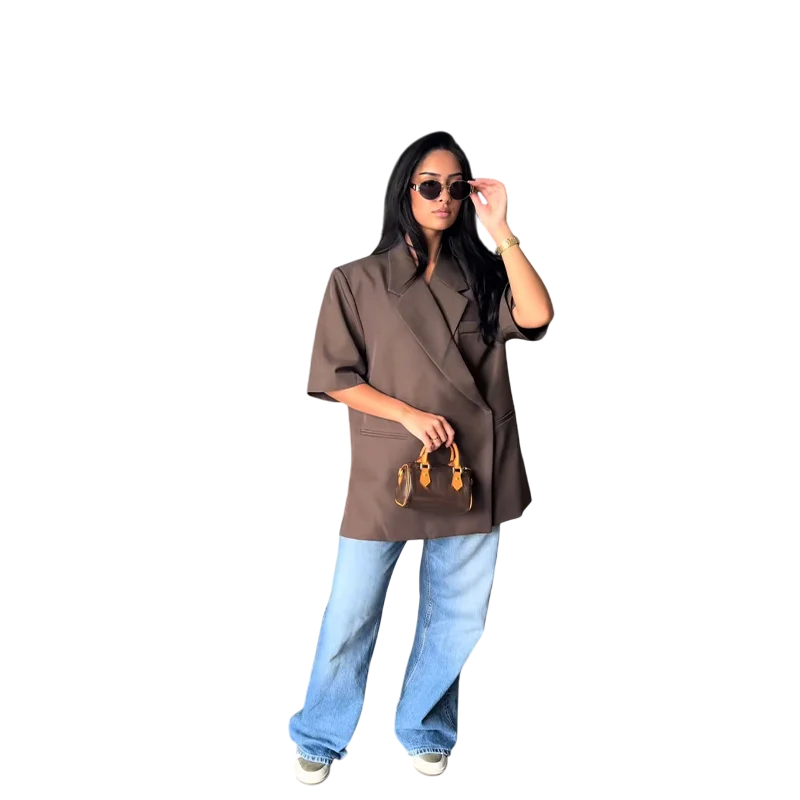 Dieses Modell ist der Beweis, dass Eleganz und Komfort Hand in Hand gehen können. Die Kombination aus Polyester und Baumwolle bietet ein hervorragendes Gleichgewicht zwischen Leichtigkeit und Langlebigkeit, während die kurzen Ärmel einen lässigen, aber dennoch eleganten Look verleihen. Der Kragen wirkt professionell und verleiht dem Outfit eine Eleganz, die Sie bei formellen und informellen Anlässen schätzen werden. Das einfarbige Design erleichtert das Kombinieren mit anderen Kleidungsstücken, egal ob Sie Röcke, Hosen oder Jeans wählen. Dieser stylische Sommerblazer ist die perfekte Wahl für Frauen, die ein zeitloses und praktisches Accessoire für ihre Garderobe suchen.