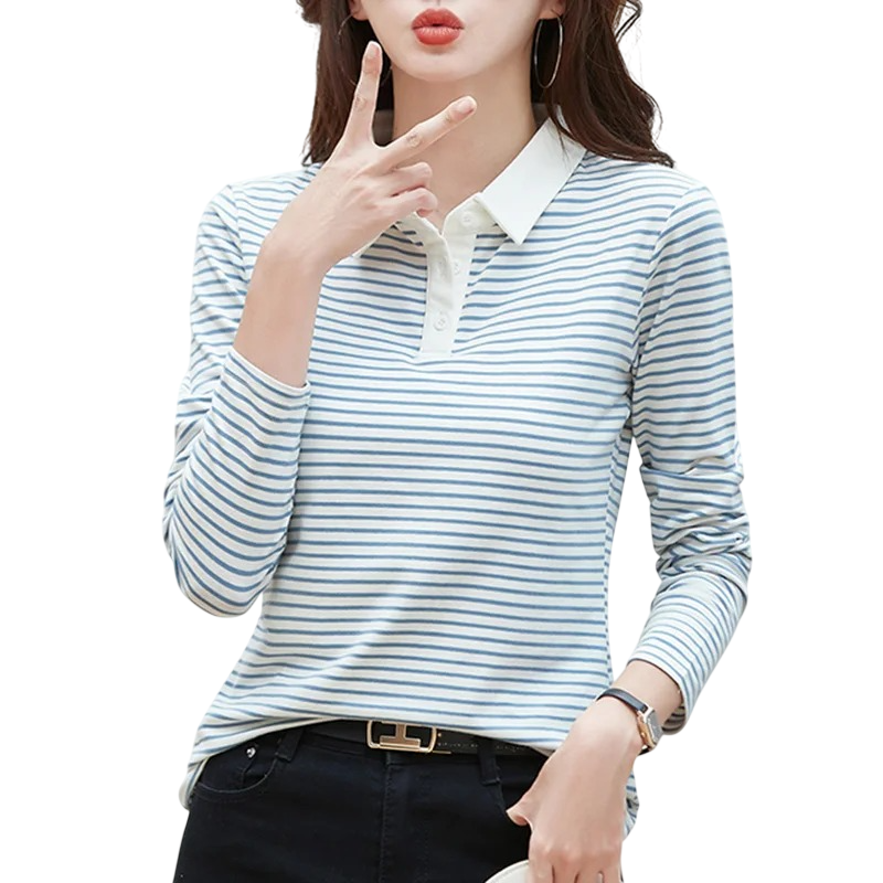 Startseite Startseite Kleidung und Accessoires Damenbekleidung T-Shirts und Tops für Damen Langärmelige T-Shirts und Tops für Damen Damen Poloshirt Langarm V-Ausschnitt Kragen Knöpfe Gestreift Baumwolle Bequem Elegant Casual Top Sommer Frühling