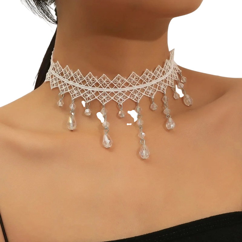 Das Design basiert auf einem detaillierten Spitzenmuster, das mit kleinen hängenden Elementen ergänzt wird. Der Spitzen Choker wirkt leicht und elegant, während hängende Anhänger Bewegung und Struktur verleihen. Die gesamte Ausführung wird durch metallische Teile aus Zinklegierung ergänzt, die die Festigkeit der einzelnen Verbindungen gewährleisten. Der praktische Verschluss ermöglicht eine einfache Handhabung beim Tragen. Durch die Kombination der Materialien entsteht ein Accessoire, das sowohl für den täglichen Gebrauch als auch für besondere Anlässe geeignet ist.
