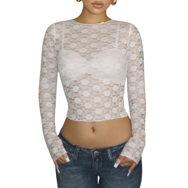 Startseite Startseite Kleidung und Accessoires Damenbekleidung T-Shirts und Tops für Damen Langärmelige T-Shirts und Tops für Damen Damen Spitzentop mit langen Ärmeln Eleganter transparenter Schnitt Atmungsaktives Material Kurzer Crop-Style Passend für Abend- und Party-Outfits