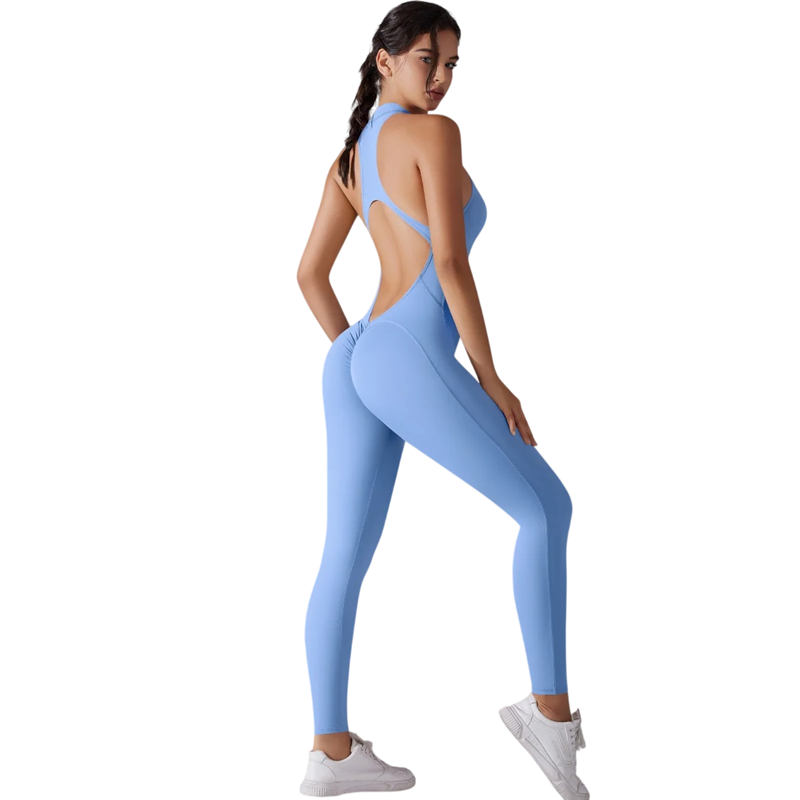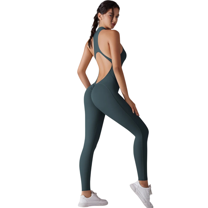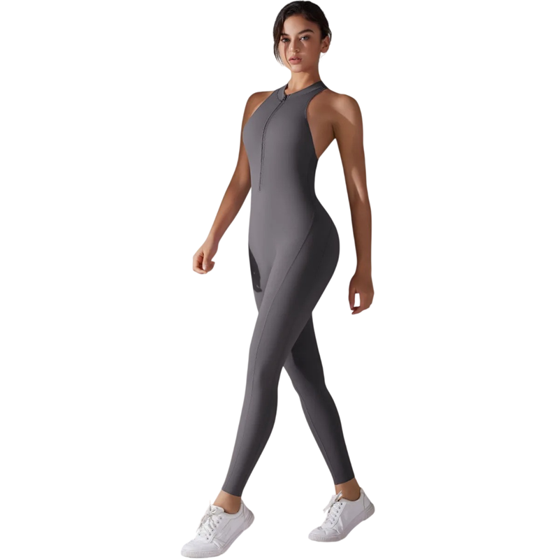 Moderner Damen Sportoverall für Fitness und Yoga, elastisches Material mit Reißverschluss im Ausschnitt und offenem Rücken bietet Komfort und Stil. Vollständige Beschreibung