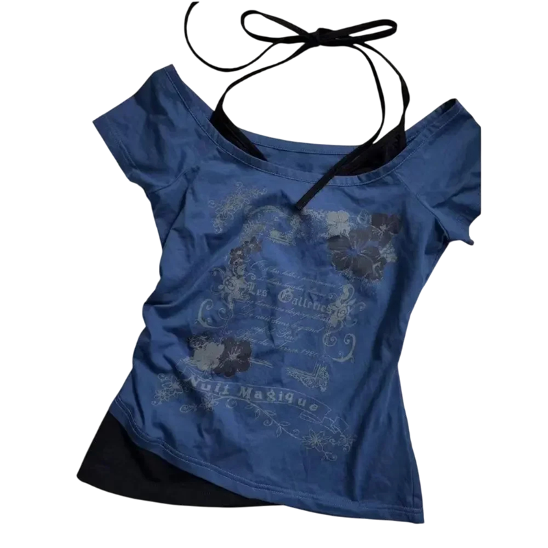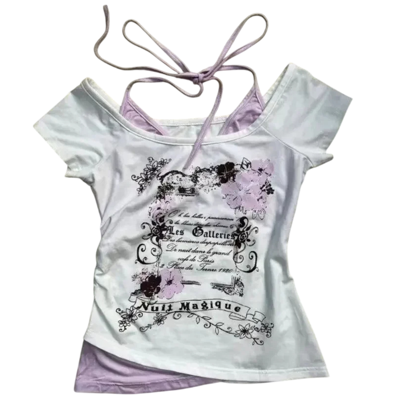Ein stylisches doppellagiges T-Shirt mit dezentem Vintage-Print und freiliegenden Schultern verbindet Tragekomfort mit romantischem Look für den Alltag und festliche Anlässe. Vollständige Beschreibung