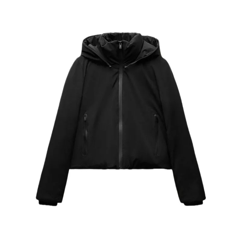 Wärmende schwarze Damen Winterjacke mit Kapuze, Reißverschluss, praktischen Taschen und strapazierfähiger Polyester Ausführung. Stylisches und bequemes Modell für winterliche Tage. Vollständige Beschreibung