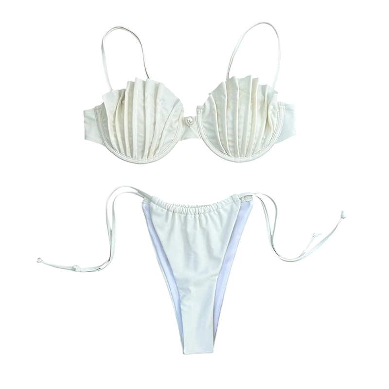 Dieser zweiteilige Bikini verleiht Ihrer Sommergarderobe einen Hauch nautischer Eleganz. Das Oberteil ist von der Form von Muscheln inspiriert und verfügt über eine dezente Bügelverstärkung, die für hervorragenden Halt und einen Push-up-Effekt sorgt. Das Unterteil hat seitliche Bänder und einen höheren Mittelausschnitt, der die Figur schön formt und gleichzeitig Bewegungsfreiheit bietet. Dank des originellen Designs und der Liebe zum Detail eignet sich dieser Badeanzug nicht nur für den Strand, sondern auch für sommerliche Fotoshootings oder zum Entspannen am Pool.