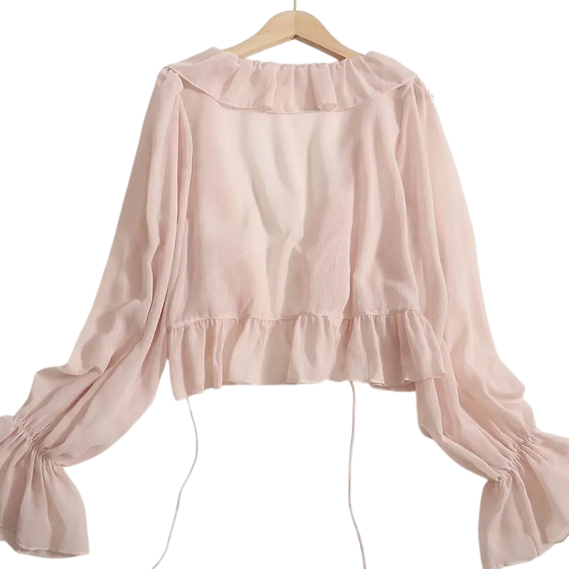Startseite Startseite Kleidung und Accessoires Damenbekleidung Blusen für Damen Langarmblusen für Damen Damenbluse V-Ausschnitt Lange Ärmel Halbtransparent Lockere Passform Raffung Kordelzug Einfarbig