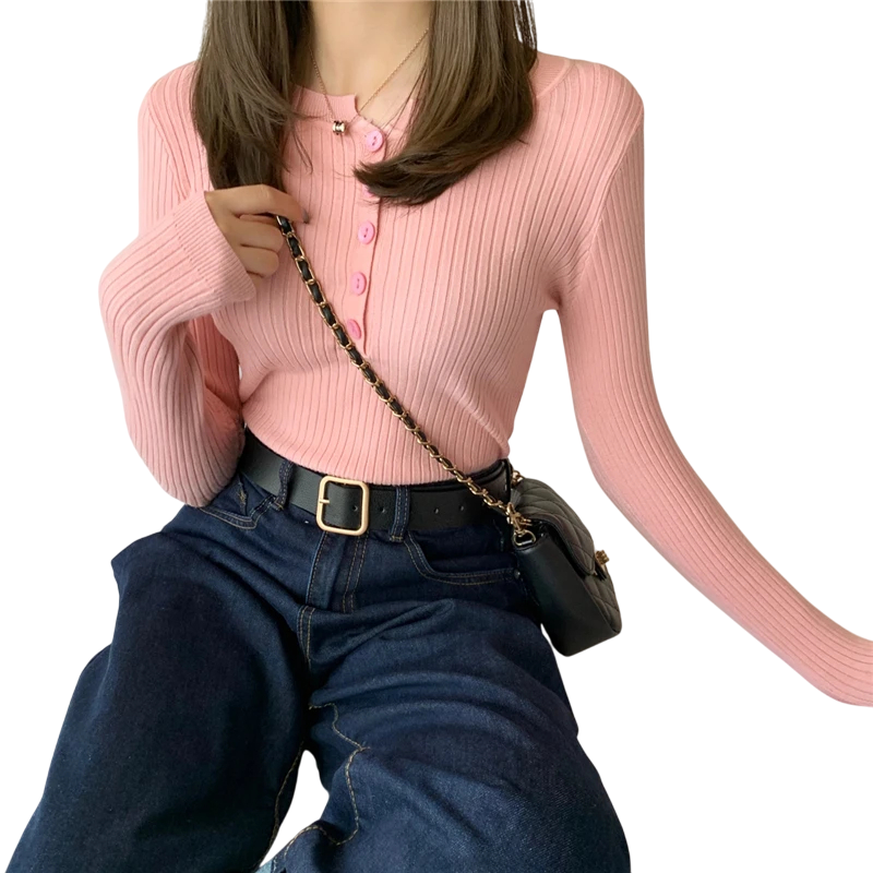 Damenkardigan aus Baumwolle und Polyester mit halbem Knopfverschluss Einfarbiger Pullover mit Rundhalsausschnitt Lange Ärmel Universelle Größe