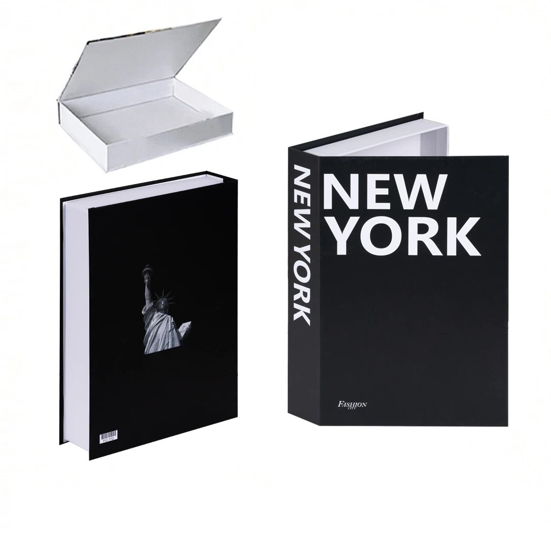 Dieses falsche Buch mit einem großartigen Design inspiriert von New York bringt nicht nur Eleganz, sondern auch praktische Nutzung in Ihr Interieur. Die schwarze Oberfläche mit der weißen Aufschrift "NEW YORK" und der feinen Illustration der Freiheitsstatue schafft ein beeindruckendes visuelles Element, das jeder Liebhaber dieser Stadt zu schätzen weiß. Das aufklappbare Design verbirgt versteckten Stauraum, der ideal ist, um kleine Gegenstände oder Wertsachen aufzubewahren.