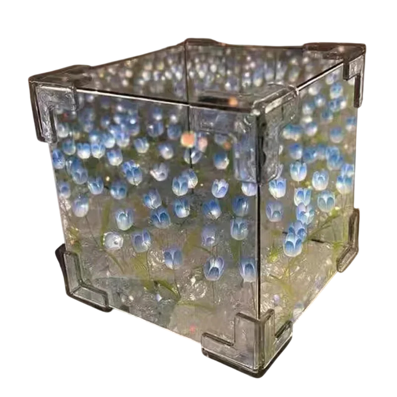 Der moderne dekorative Lichtwürfel mit LED-Tulpen schafft eine sanfte Atmosphäre und dient als stilvolles Accessoire für das Interieur. Vollständige Beschreibung