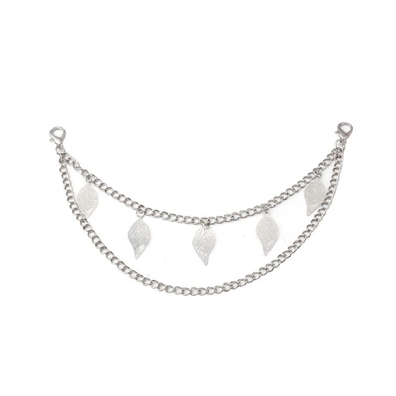 Der Kettenriemen hat eine doppelte Konstruktion, die aus zwei Ketten mit Längen von 22 cm und 31 cm besteht. Bestandteil der kürzeren Kette ist ein doppelter Anhänger mit Blättern, der das Hauptdekorationsmerkmal dieses Zubehörs bildet. Metallblätter sind an der Kette aufgehängt und bilden ein markantes Motiv.