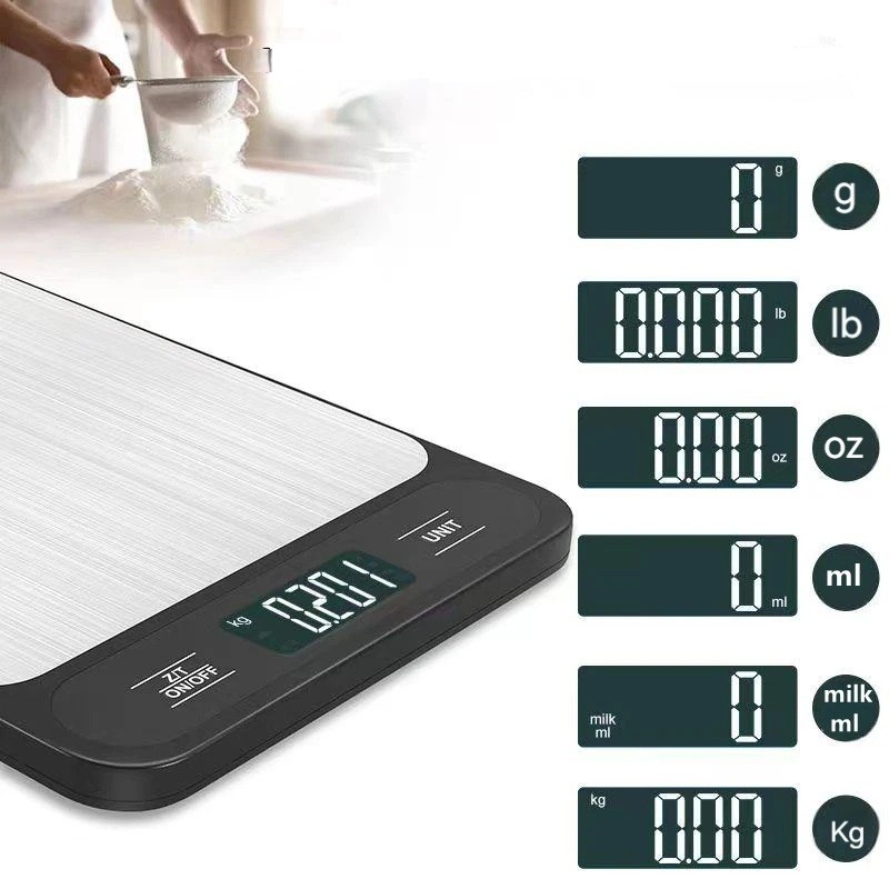 Das Gerät bietet mehrere Maßeinheiten – g, kg, lb, oz, ml und Milch (ml), was präzises Wiegen von trockenen und flüssigen Zutaten ermöglicht. Das übersichtliche digitale Display erleichtert das Ablesen der gemessenen Werte. Die Stromversorgung erfolgt durch 2× AAA Batterien (nicht im Packungsinhalt enthalten), was einen einfachen Austausch ohne Aufladen ermöglicht.