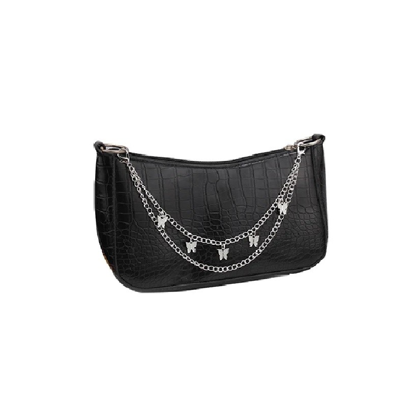 Die Kette hat eine doppelte Konstruktion, die aus zwei separaten Ketten besteht, die an Karabinern an beiden Enden befestigt sind. An der Kette sind Schmetterlingsanhänger angebracht, die ein dekoratives Motiv bilden und beim Tragen der Handtasche gut sichtbar sind.