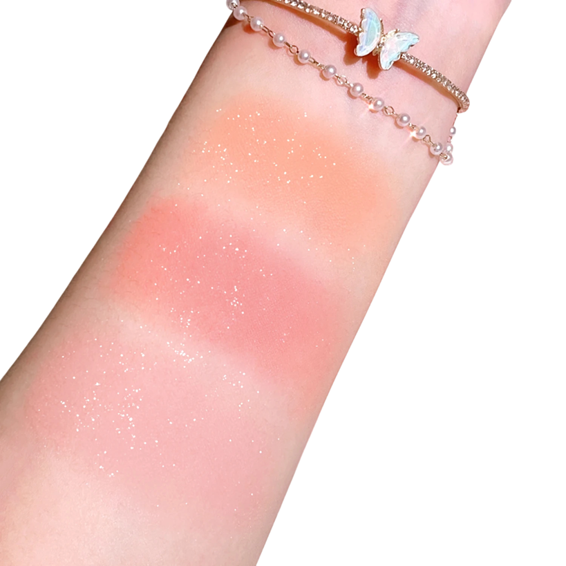 Startseite Startseite Gesundheit und Schönheit Gesichtsmakeup Contouring, Bronzer und Highlighter Dreifarbige schimmernde Rouge-Palette 3 Farbtöne Aufhellendes langanhaltendes Rouge Lidschatten und Highlighter Multifunktionales Make-up