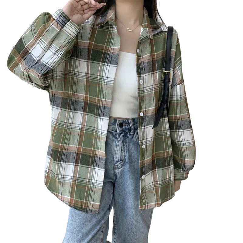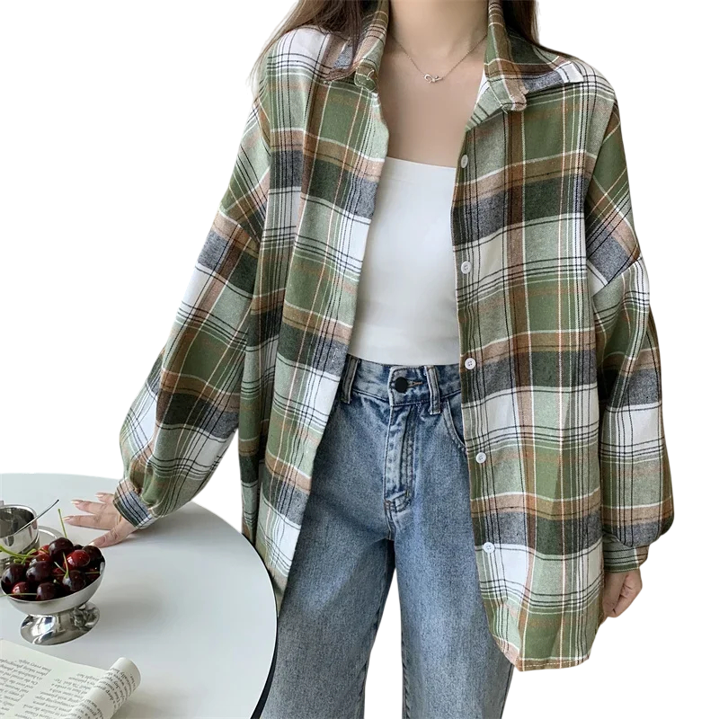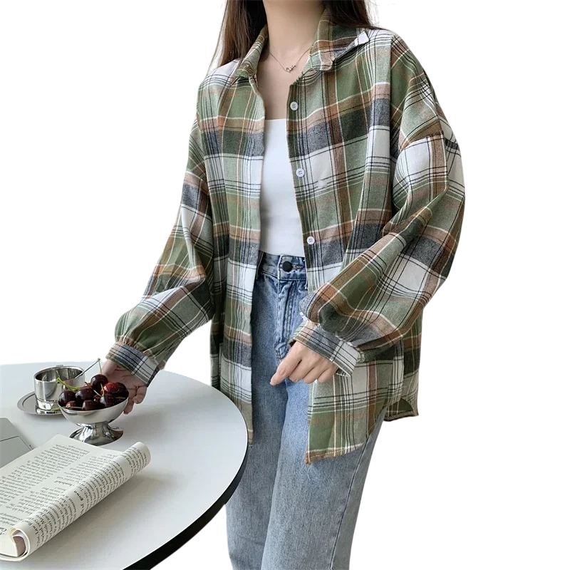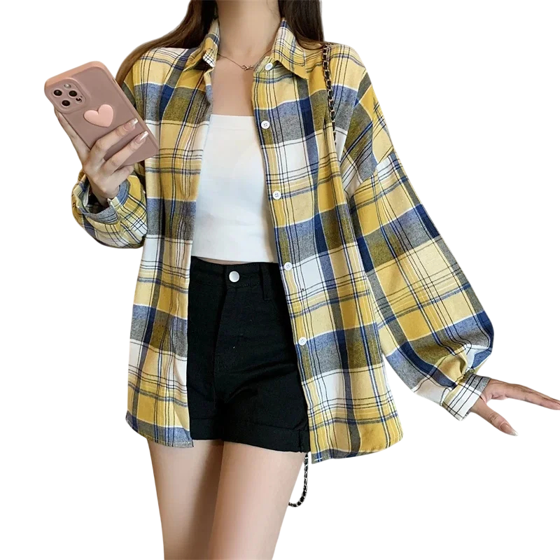 Startseite Startseite Kleidung und Accessoires Damenbekleidung Hemden für Damen Karierte Hemden für Damen Elegante Damen-Karohemd mit Kragen Freier Schnitt mit Knopfverschluss Leichte Polyesterbluse für Arbeit und Freizeit