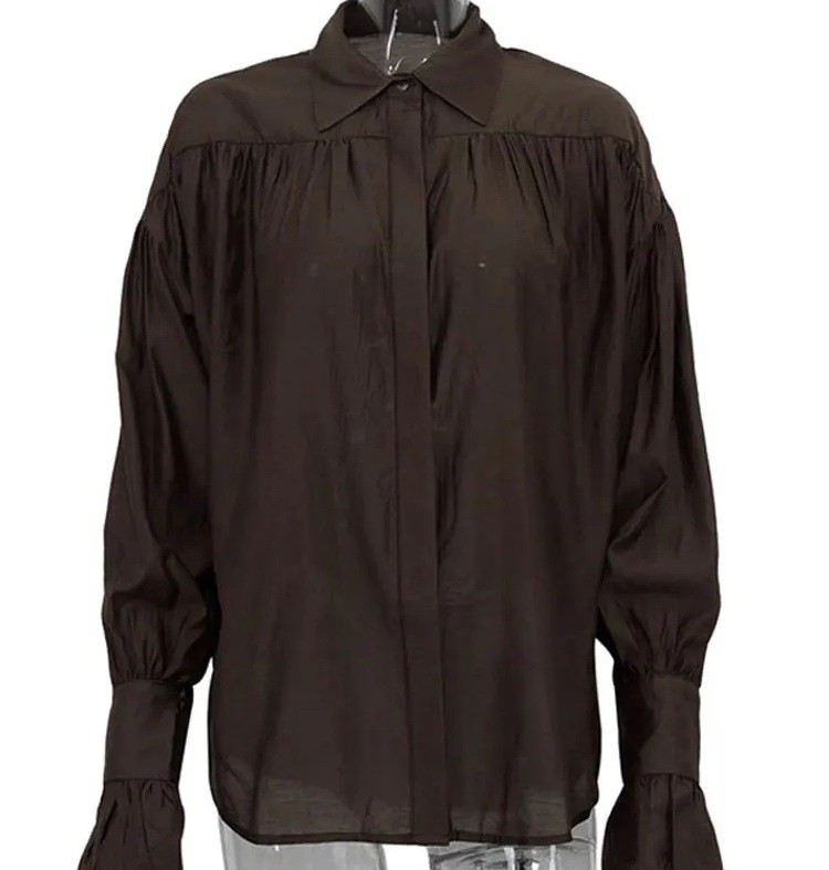 Startseite Startseite Kleidung und Accessoires Damenbekleidung Hemden für Damen Freizeithemden für Damen Elegante Damen transparente Bluse mit langen Ärmeln Einfarbige Bluse aus Polyester mit ausgestellten Ärmeln und Kragen Stilvolles Knopf-Top