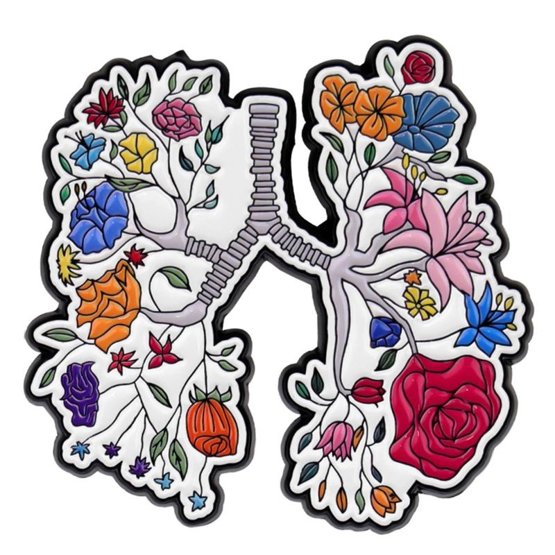 Diese Anstecknadel lässt sich leicht an verschiedenen Materialien befestigen und mit weiteren Accessoires kombinieren. Sie ist geeignet als kleines Geschenk oder als individueller Akzent, um ein Outfit zu vervollständigen. Das Motiv der Lungen mit Blumen bietet einen unkonventionellen Blick auf die klassische Brosche und wirkt visuell interessant.