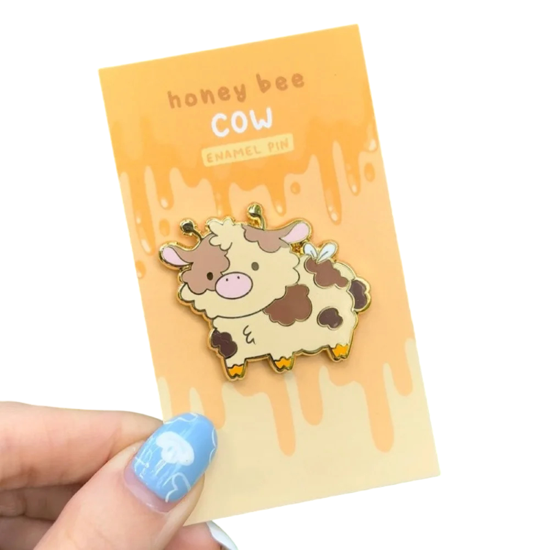 Metallischer Anstecker mit gezeichneter Kuh im Bienenstil. Verspieltes Zubehör für Rucksack, Jacke und Revers mit feinen Details und originellem Motiv. Vollständige Beschreibung