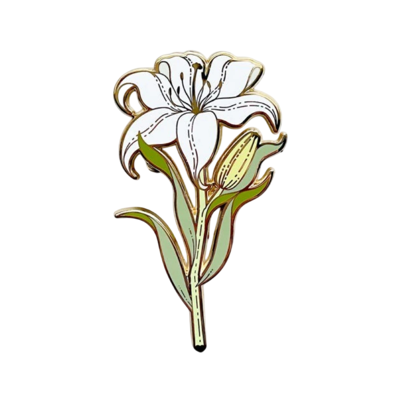 Emaille-Pin mit dem Motiv einer weißen Blume besticht durch sein klares und übersichtliches Design, das natürlich und unauffällig wirkt. Die Blume wird in offener Form mit markanten Linien dargestellt, die die einzelnen Blütenblätter und Details der Mitte hervorheben. Dadurch ist das Motiv auch in kleinerer Größe gut lesbar.