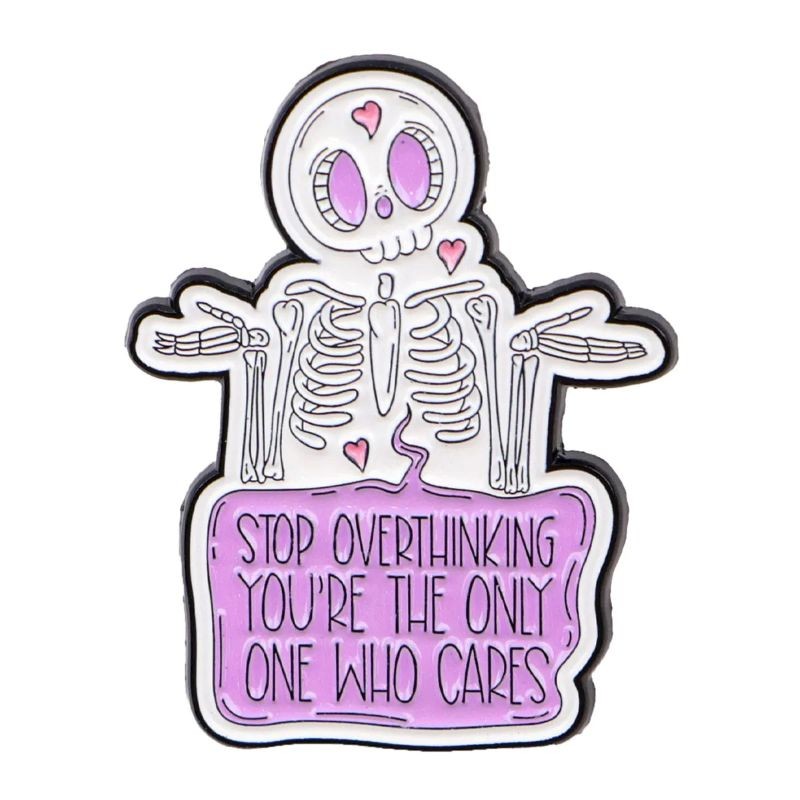 Emaille-Pin mit Zitat Skelett ca. 3,5 × 2,7 cm Metallbrosche weiß schwarz rosa gezeichnetes Motiv Zubehör für Rucksack Revers