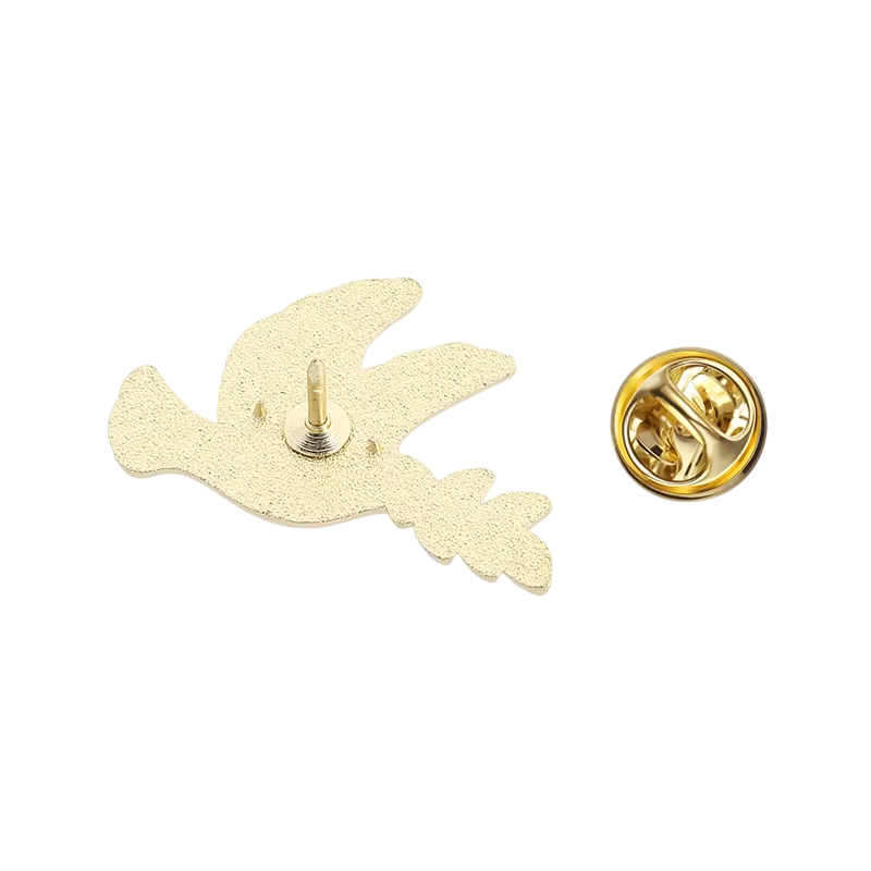 Der Emaille-Pin mit dem Motiv einer Taube ist ein feiner Accessoire, inspiriert von einem natürlichen Thema. Das Design zeigt eine fliegende Taube, die einen Olivenzweig hält, was ein harmonisches und ausgewogenes Erscheinungsbild schafft. Die Kombination aus Weiß und Grün, ergänzt durch einen metallischen Rand, wirkt klar und übersichtlich.