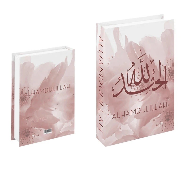 Elegantes falsches Buch mit zartem röslichem Blumenmotiv und dem Schriftzug Alhamdulillah stellt ein stilvolles Accessoire für moderne und romantisch gestaltete Innenräume dar. Die Pastellfarben wirken sanft, harmonisch und schaffen eine angenehme Atmosphäre. Es handelt sich um eine nicht zu öffnende Buchattrappe, die ausschließlich als Dekoration dient. Dank der realistischen Verarbeitung wirkt es wie ein echtes Exemplar, das in der Bibliothek ausgestellt ist.