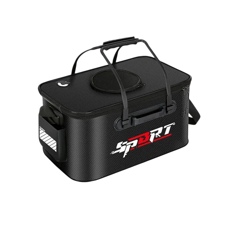 Diese Anglerbox ist mit einem stabilen Reißverschlussdeckel ausgestattet, der hilft, den Inhalt sicher im Inneren zu halten. Der praktische obere Griff ermöglicht ein bequemes Tragen, selbst bei voller Beladung. Dank der wasserfesten Ausführung ist der Eimer ideal für die Aufbewahrung lebender Fische während des Angelns oder beim Transport. Das Material ist für den Außeneinsatz und normale Belastungen ausgelegt.