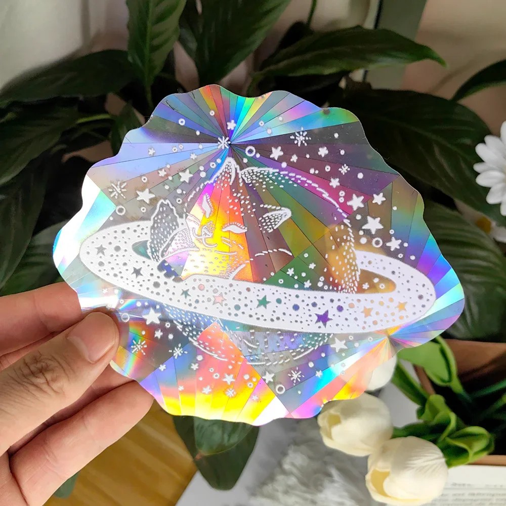 Fensteraufkleber 12,7 cm PVC Regenbogen Sonnenfänger Motiv Katze und Planet Dekorative Fensterfolie mit Farbeffekt