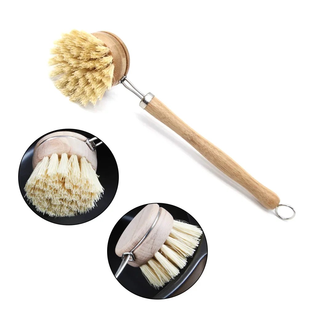Geschirr Bürste 23 x 4 x 4 cm Holzgriff Natürliche Borsten Drehbarer Kopf Metallaufhängung Küchenreinigungsbürste