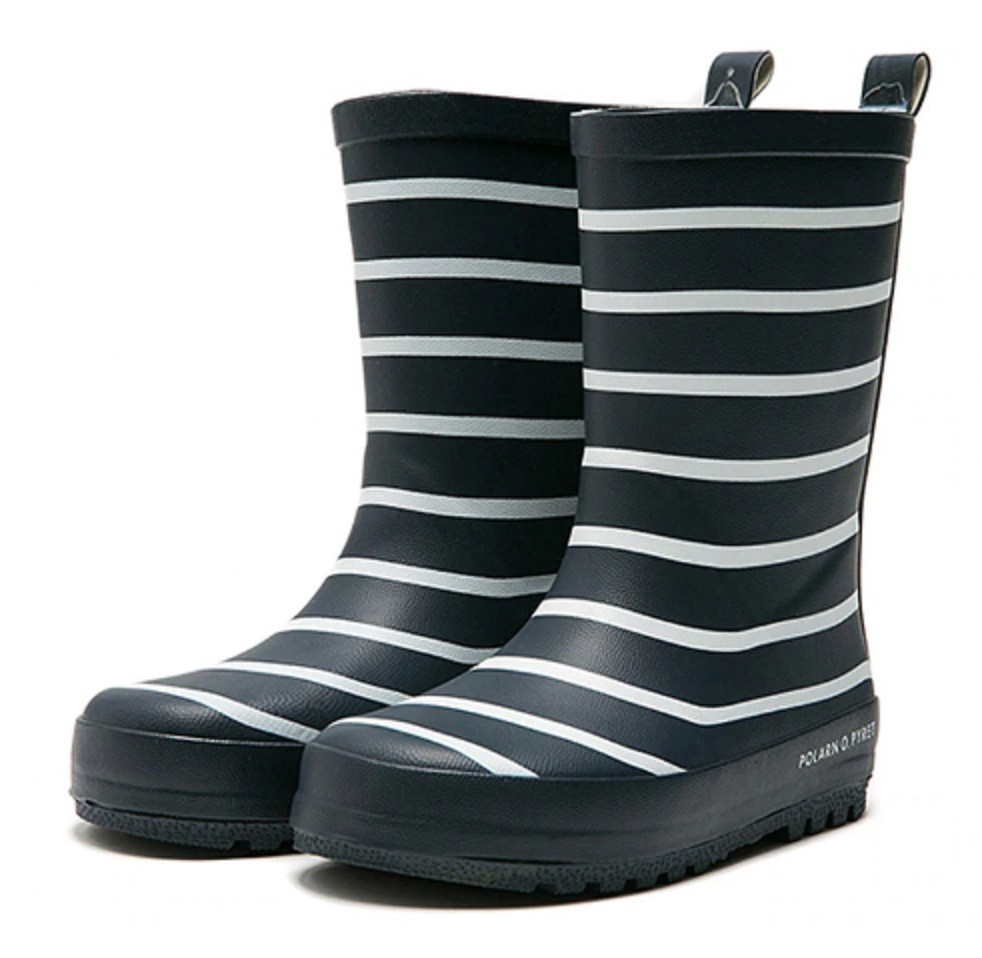 Gestreifte Gummistiefel für Kinder sind bei Regenwetter ein toller Helfer.