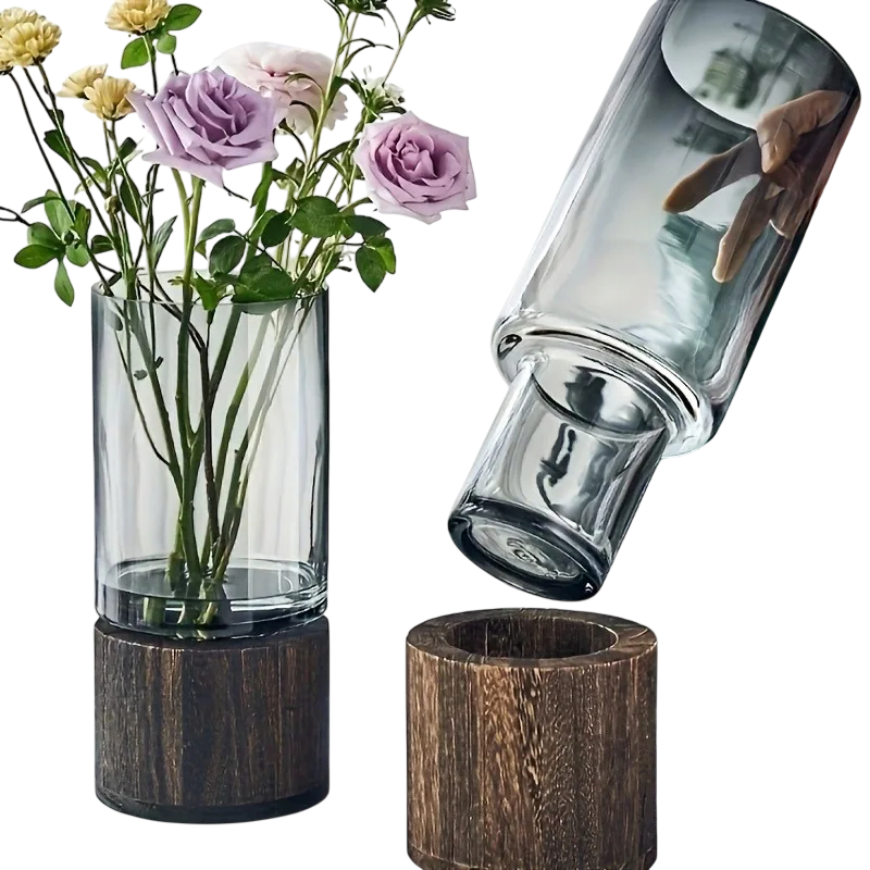 Glasvase 25 x 12 cm Leichte luxuriöse Retro-Vase für Blumen mit Holzständer Dunkelgraues dekoratives Glas moderne Wohnkultur