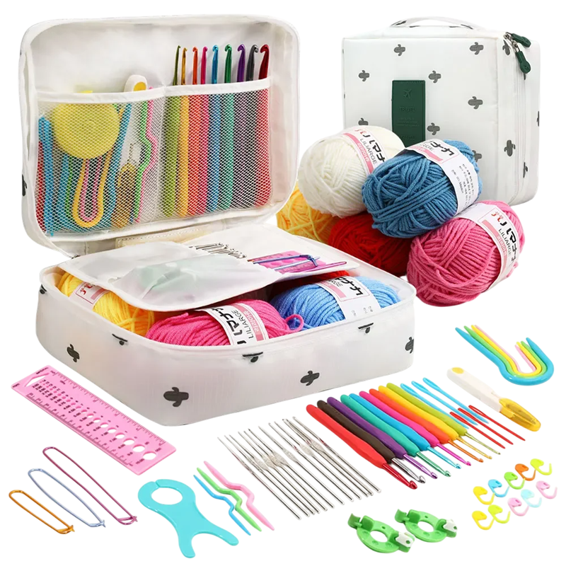 Komplettes Set zum Häkeln mit Garnen, Häkelnadeln, Nadeln und Zubehör in einem praktischen Etui, ideal für Anfänger und Fortgeschrittene. Vollständige Beschreibung