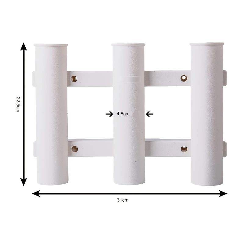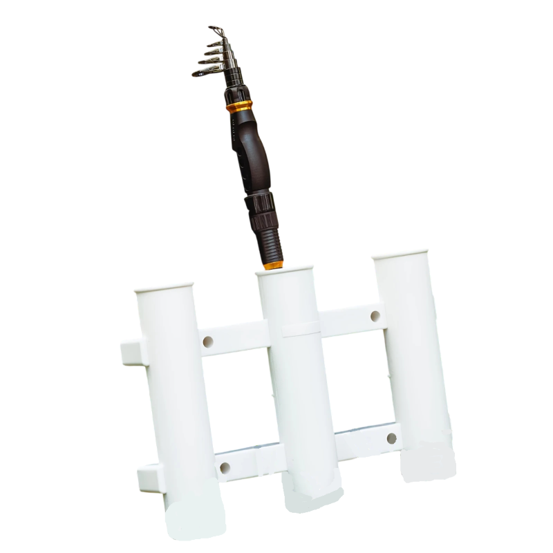 Jeder Halter hat ein eigenes Rohrloch, das eine stabile Unterstützung für die Rute bietet. Die Abstände zwischen den einzelnen Positionen sorgen für eine bequeme Lagerung und Entnahme ohne unnötige Handhabung. Dieser Haltertyp ist für verschiedene Arten von Angelruten und Zubehör geeignet.