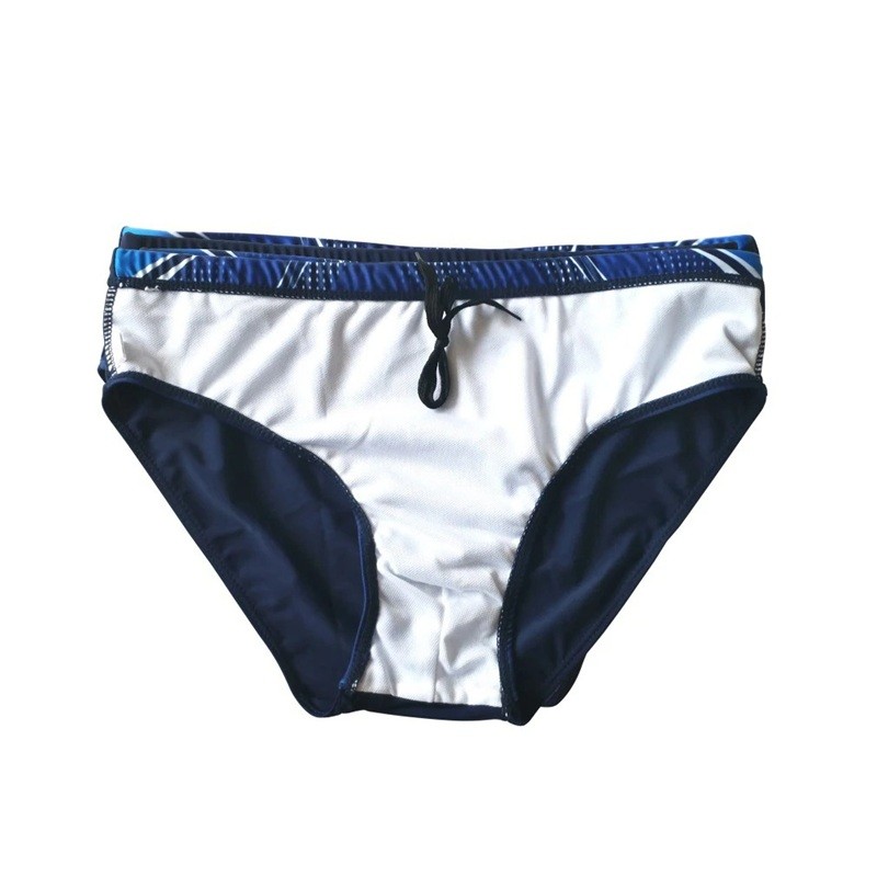 Dunkelblaue Slip-Badehose mit Streifen, schnelltrocknendes Material und Kordelzug in der Taille für bequemes Schwimmen und Entspannen am Wasser. Vollständige Beschreibung