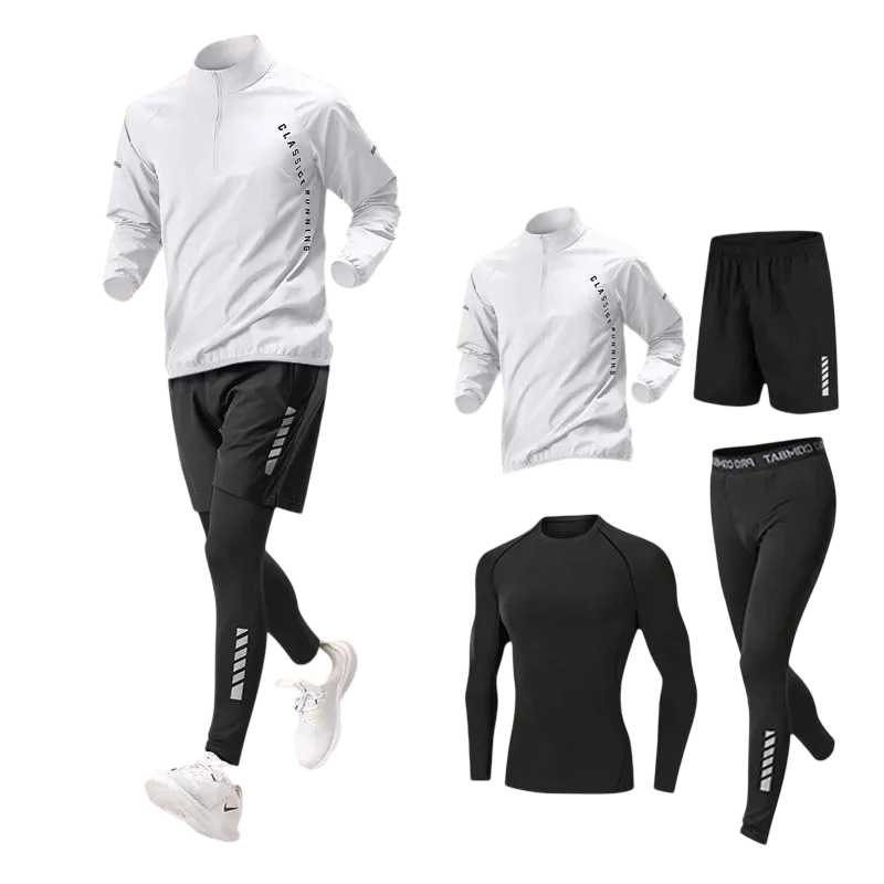 Herren Sportanzug mit Leggings, Shorts, Sweatshirt und Langarmshirt, hergestellt aus Polyester und Spandex. Ideal für sportliche Aktivitäten und Freizeit. Vollständige Beschreibung